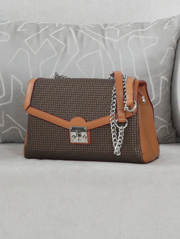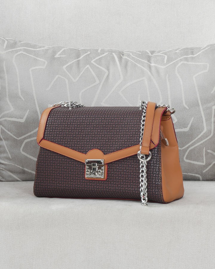 Textured Leather Handbag with Chain Strap & Lock Closure